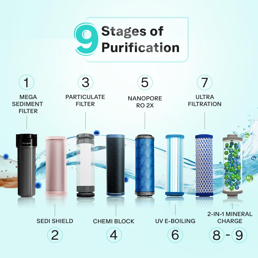 Superior 9-Stage Purification including RO+UV+UF (a) RO Maxx 2X: Offers protection against pesticides, microplastics, and industrial waste | (b) UV e-boiling: Ensures each drop of water is as pure as water boiled for 20+ minutes | (c) Ultra Filtration: Makes your water crystal clear by removing ultra-fine suspended particles
