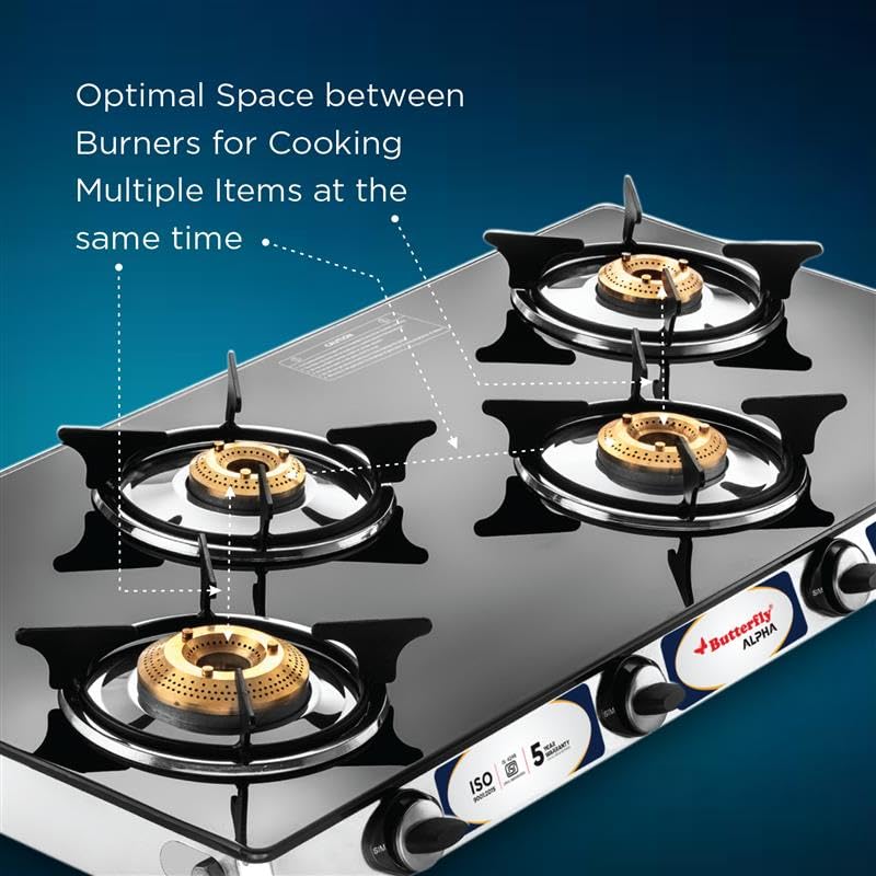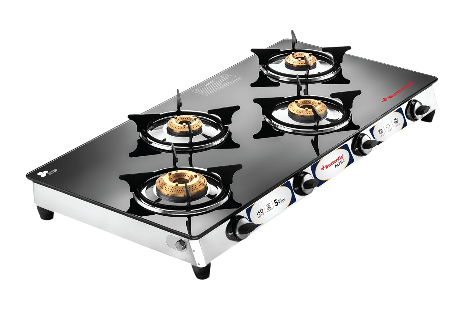 Butterfly Alpha 4 Burner Glass Top Gas Stove | Black