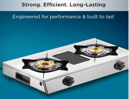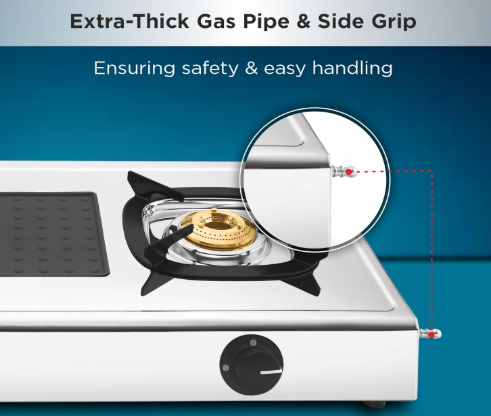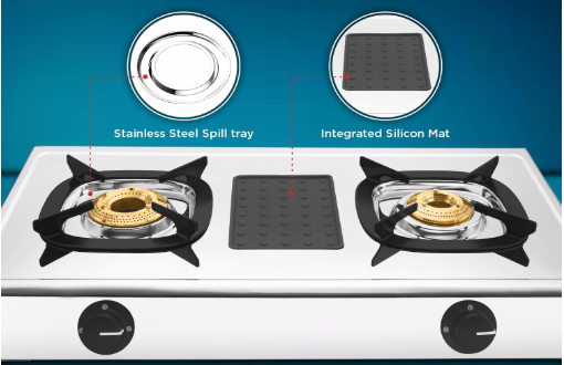 - High Thermal Efficiency Brass burners, Detachable Stainless Steel Spill Tray, ABS Knob for Durability, Scratch Proof Enameled Pan Support, Removable Silicon Pad for holding Spoons & Laddles , Side Grip Holder for Ease of use and handle.