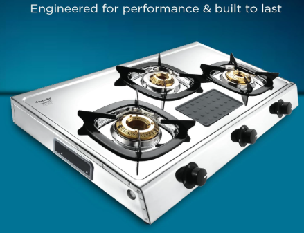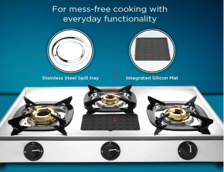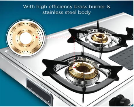 - High Thermal Efficiency Brass burners, Detachable Stainless Steel Spill Tray, ABS Knob for Durability, Scratch Proof Enameled Pan Support, Removable Silicon Pad for holding Spoons & Laddles, Side Grip Holder for Ease of use and handle.