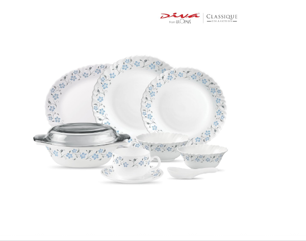 La Opala Diva Classique Collection Opal Glass Crockery | Dinner Set 61 pcs Grace Blue