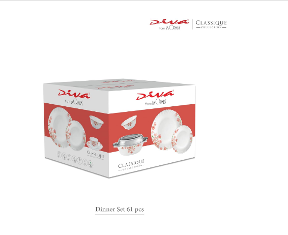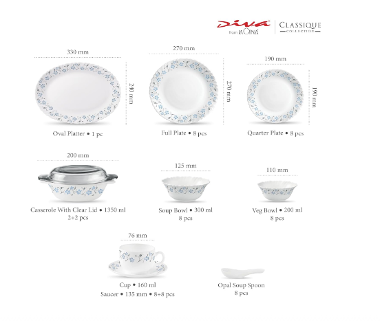• Package Contents: 8N Full Plate (270 mm), 8N Quarter Plate (190 mm), 8N Vegetable Bowl (200 ml) , 8N Soup Bowl (300 ml), 8N Spoon, 1N Oval Platter (330 mm), 2N Casserole (1.35 L), 2N Casserole Lid (Clear), 8N Cup (160 ml) & 8N Saucer (135 mm)