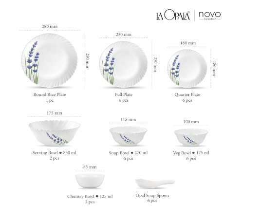 • 6-Pcs Full Plate, 6-Pcs Quarter Plate, 1-Pc Rice Plate, 2-Pcs Serving Bowl, 6-Pcs Soup Bowl, 6- Pcs Veg Bowl, 6-Pcs Spoon, 2-Pcs Chutney Bowl