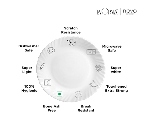 • 100% Bone Ash Free, 100% Vegetarian, Thermal Shock Resistant, Toughened Extra Strong; Thermal Shock Resistant, Food grade 100% hygienic, Break, Chip & Scratch Resistant Super Light & Stackable, Extra strong – fully tempered toughened glass, Lightweight and stackable makes it easy to use, easy to clean and easy to store