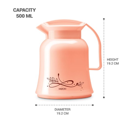 Color: Peach; Material: Inner – Glass, Outer – Plastic; Package Contents: 1 – Piece of Crystal Vacuum Flask (500 ml); Product Dimension in cms (L x W x H): 16.1 x 14.1 x 19.3