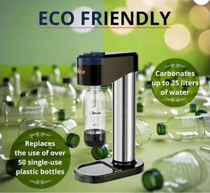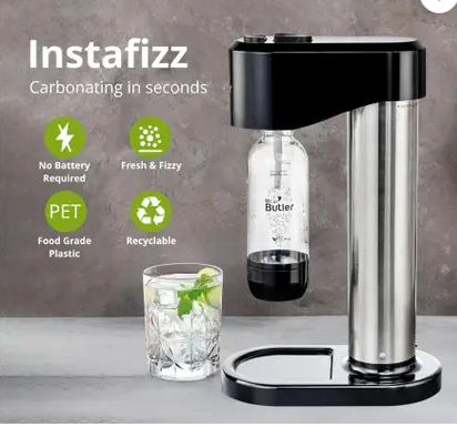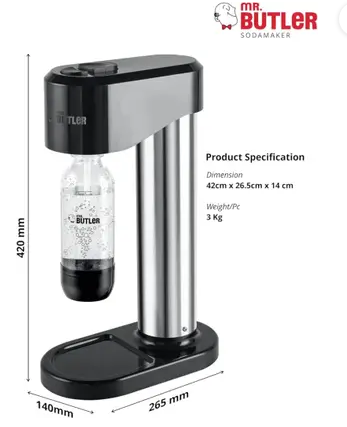 - Effortless Carbonation: Mr Butler Sodamakers transform tap water into refreshing sparkling water with the simple push of a button., Customizable & Healthier Beverage Choices: Create your own flavored sodas by adding natural fruit juices or syrups., Eco-Friendly and Sustainable: Reduce your carbon footprint with reusable bottles and a refillable CO2 cylinder., Cost-Effective: Save money on store-bought carbonated beverages. Make sparkling water and soda at a fraction of the cost. An ideal gift for soda lovers and home beverage enthusiasts., Compact and Stylish Design: Sleek, modern design fits seamlessly into any kitchen decor., One pack includes one Sodamaker unit, One CO2 cylinder that can make around 25 Litres or 125 glasses of soda out of each cylinder and one 500ml PET Bottle.