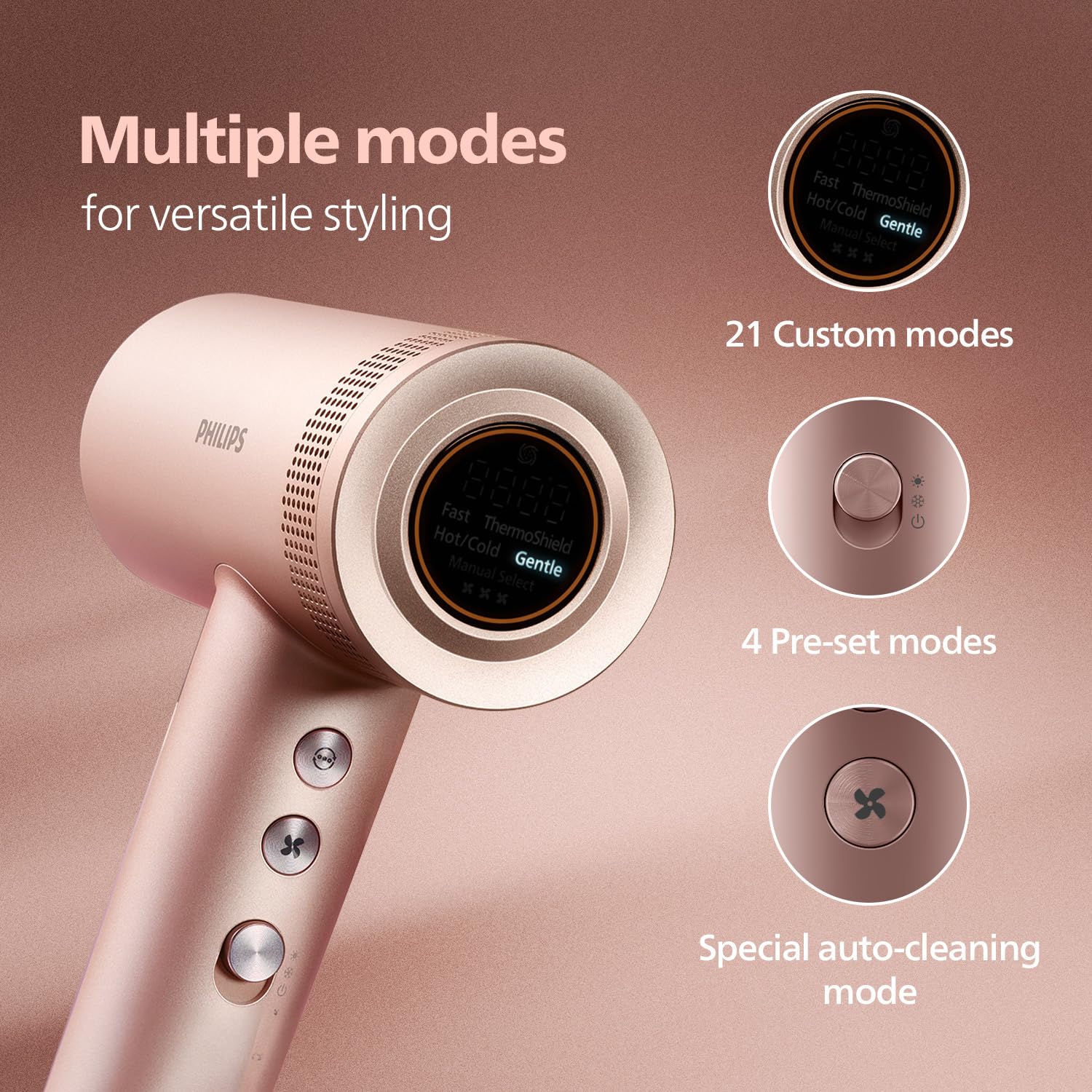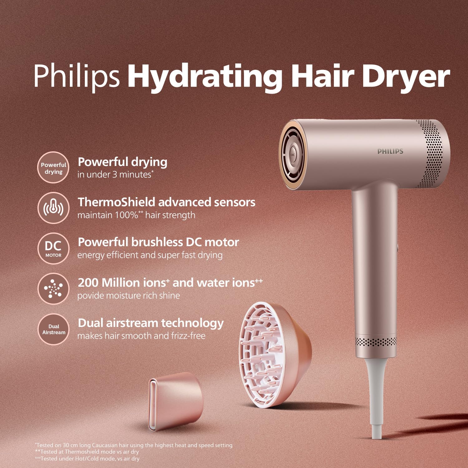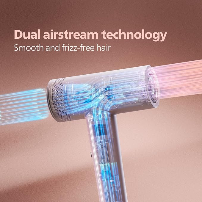 Dual Airstream technology provides more shine and reduces static charged hair by pulling the air from two inlets simultaneously and condensing them into a powerful airflow