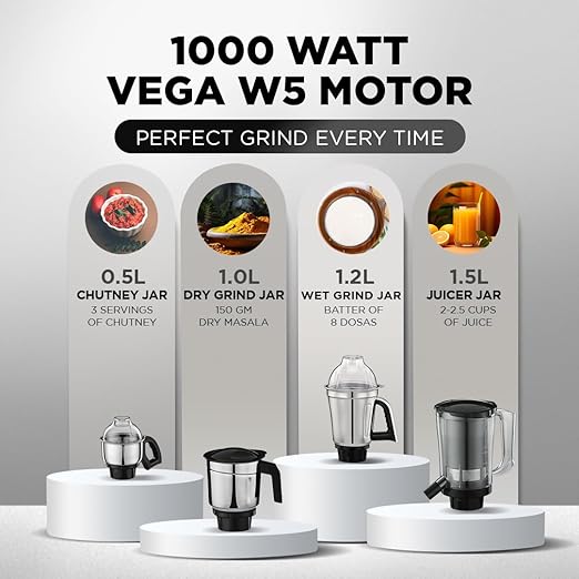 Powerful 1000 Watt motor for perfect grinding in 90 sec; 2 Year Product Guarantee, Life long free Service – No Labour Charge