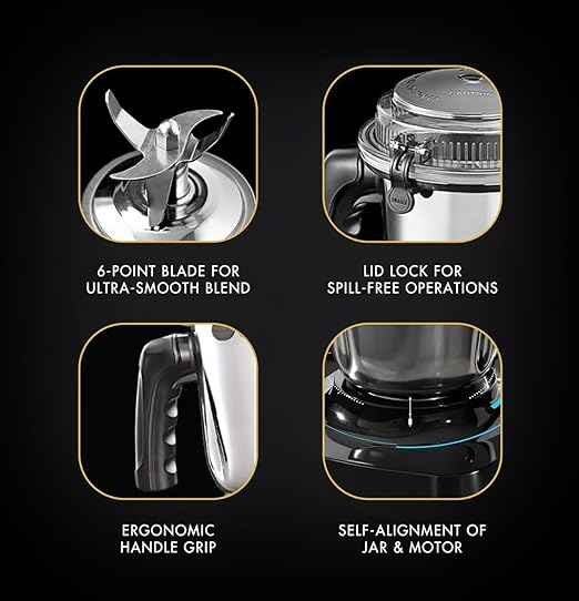 Jar Set Included: 1.75 L Transparent Blender Jar (Unbreakable) Ideal for shakes, smoothies, purees, cold coffee, cocktails, mocktails, buttermilk, and more. 1 L Stainless Steel Dry Grinding Jar Multipurpose jar for grinding masalas, spices, cereals, pulses, coffee beans – suitable for both dry and wet grinding. 500 ml Stainless Steel Chutney Jar with Safety Lock Perfect for making chutneys, dips, pastes like ginger-garlic, coconut, mint, tamarind, etc.