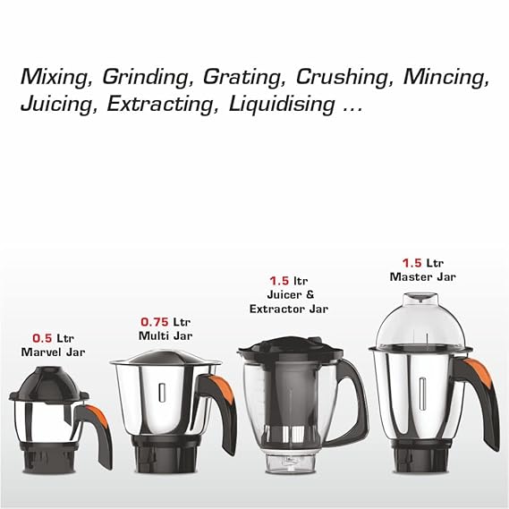 Self-Locking Jars ensure secure mating of Jar with Mixer Base eliminating wear and tear of Couplers and allows for easy “Pick & Place” of Jars. Penta-Drive Couplers are self-aligning, high strength & designed to withstand the high torque and load required for tough grinding applications suited to Indian cooking.