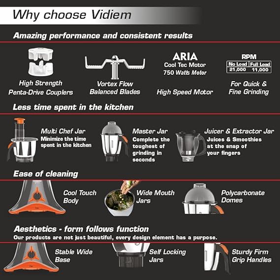 Vidiem ADC,mixer grinder 750 watt+ – Your All Day Companion Mixing, Grinding, Grating, Crushing, Juicing, Blending, Liquidising, Extracting, Thick & Thin Slicing, Chopping,Mincing, Coconut Grating , Atta Kneading, Citrus Juicing. 2 Litre Stainless Steel Multi Chef with Double reduction Gear Box for High Torque & Low Noise with Polycarbonate Lid.