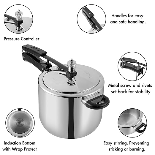 𝐌𝐀𝐗𝐈𝐌𝐈𝐙𝐄𝐃 𝐂𝐎𝐎𝐊𝐈𝐍𝐆 𝐒𝐏𝐀𝐂𝐄 : The inside-fitting lid design of the Vinod Pressure Cooker provides extra cooking space, making it perfect for preparing meals for 5-7 people.